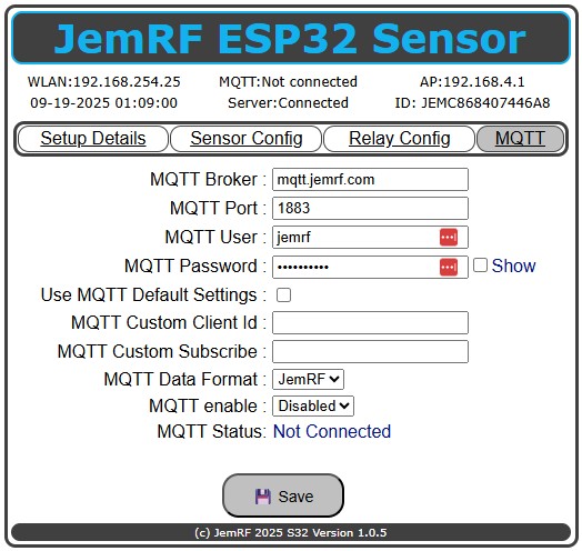 The JemRF ESP32 WiFi Sensor has a built-in MQTT Client. It supports the same MQTT features as the Smart Gateway and WiFi Gateway. They can all send data to the Monitoring Server, which will store and display the readings on the user’s Dashboard. They can also connect to a MQTT Broker and publish the sensor readings. It can do both at the same time, or just send to the Server or the Broker. You can now use tools like Node-Red to build your own monitoring displays.