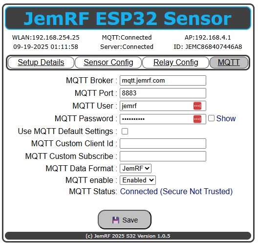 Like the JemRF Gateways, the ESP32 WiFi Sensor comes preset to Port 1883 and is configured to use the JemRF Broker. The default username is jemrf, and the default password is mqtt4jemrf. If you want a private account, contact sales @ jemrf.com. The JemRF WiFi Sensor can also make a Secure Connection. If the port numbers are 8000 or higher, the Sensor will attempt to make a Secure and Trusted Connection. If the Secure and Trusted fails, it will try a Secure and UnTrusted. Untrusted is caused when the site Certificate is not current or cannot be validated. A typical Example is using a self-signed certificate. A Secure, encrypted connection is made, but because the certificate cannot be validated, it is flagged as Untrusted. As shown in Figure 2.